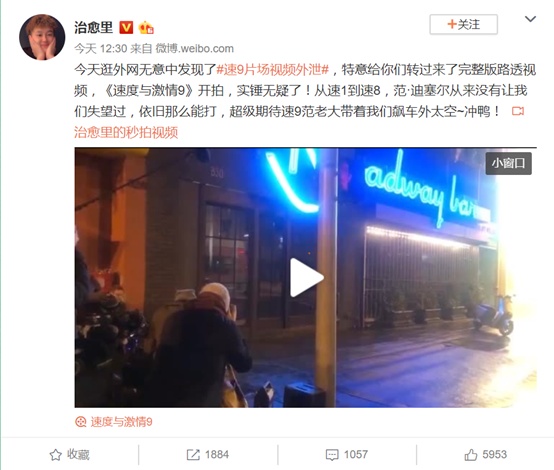 视频中的拍摄场景应该是在酒吧外的街道。在导演喊出Action后,范迪塞尔就酒吧里破窗而出,随后起身就跑到了街上的电动车处。虽然视频片只有短短的12秒,但是从范迪塞尔破窗后华丽的落地翻滚,就可看出该拍摄现场有多惊心动魄了。网友们直呼:看来是有望在2019年底在电影院里看到《速9》了。